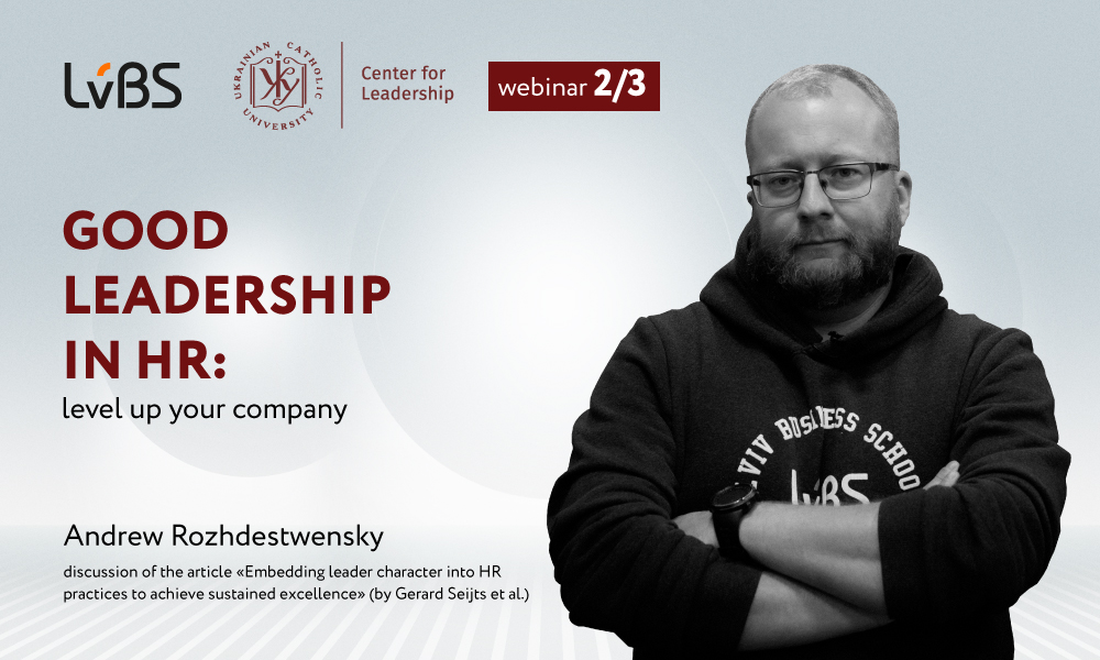 Запрошуємо відвідати серію тематичних вебінарів від LvBS та Центру Лідерства УКУ «Характер лідера: створення ефективної команди». Другий вебінар із серії відбудеться 1 квітня на тему: «Лідерство в HR: новий рівень для компанії». Разом із CEO Центру лідерства УКУ Андрієм Рождественським ми будемо дискутувати довкола тематики статті «Embedding leader character into HR practices to achieve sustained excellence» Жерарда Сейтса – виконавчого директора Інституту лідерства Ігоря Ігнатовича у Ivey Business School (Канада).