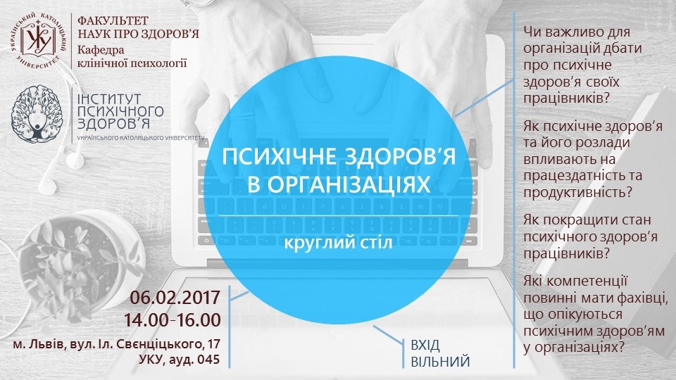 Український католицький університет планує запуск нової магістерської програми «Психічне здоров’я в організаціях». Аби зробити її не лише якісною, а й актуальною, працедавців, HR-директорів, інших управлінців запрошуємо на круглий стіл, метою якого є спільна робота над тим, аби зробити програму максимально наближеною до організаційних реалій.