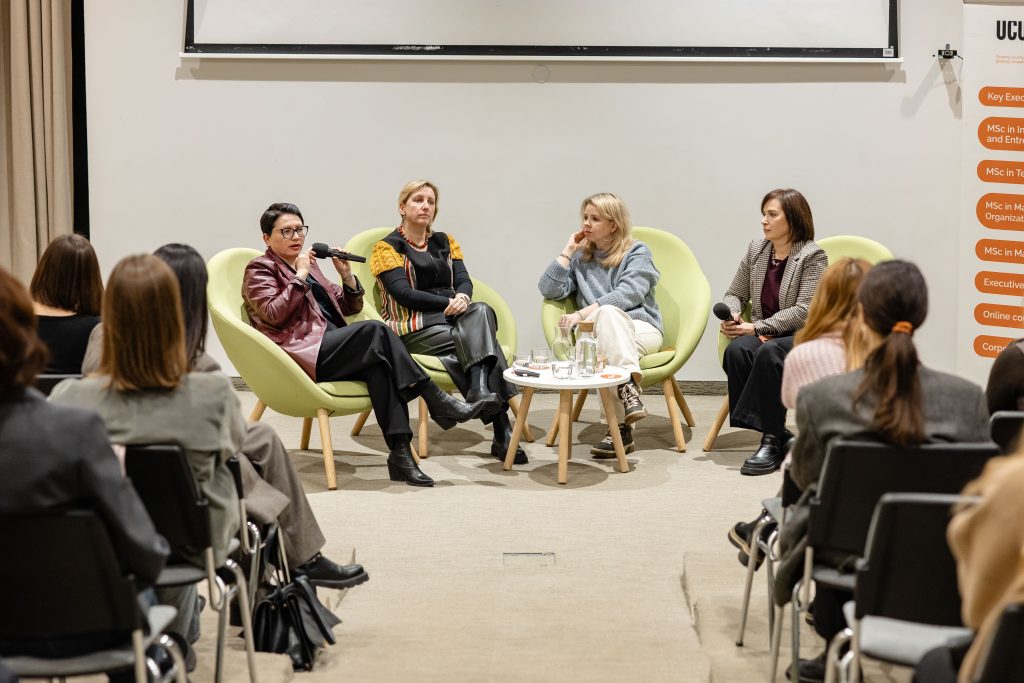 Після виступу Олександри розпочалась панельна дискусія за участі декан-засновниці та Голови Наглядової ради Бізнес-школи УКУ, проректорки зі стратегічного розвитку УКУ Софії Опацької, СЕО Бізнес-школи УКУ Ярини Бойчук, Олександри Фідкевич та Оксани Волчко. Оксана Волчко – фінансистка, довший час обіймала посаду в управлінні мультинаціональними компаніями у АТ «Райффайзен Банк Аваль» спеціалістка з корпоративного управління, менторка, лекторка, та підтримувачка незалежної якісної освіти в Україні. Перша жінка незалежна директорка у стратегічних державних підприємствах. Незалежна членкиня Наглядових рад ПАТ «Укрпошта» та АБ «Укргазбанк». Вона висловилась на тему жіночого лідерства так: