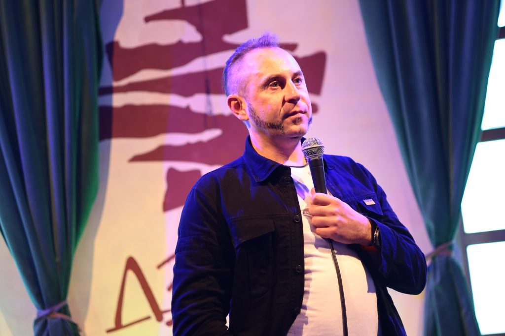 Студенти слухали історію виникнення «Дзиґи» за ранковою кавою з одним із засновників — Влодком Кауфманом. Влодко Кауфман — відомий український художник та перформер, розповів учасникам, як усе починалось: а саме наприкінці 1990-х у Львові на хвилі фестивалю «Вивих» почала формуватися незалежна мистецька сцена, і якраз «Дзиґа» стала її беззаперечним символом.