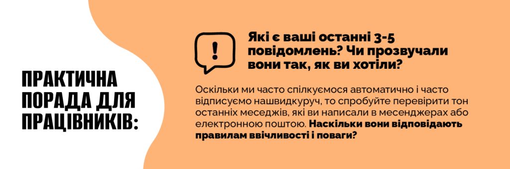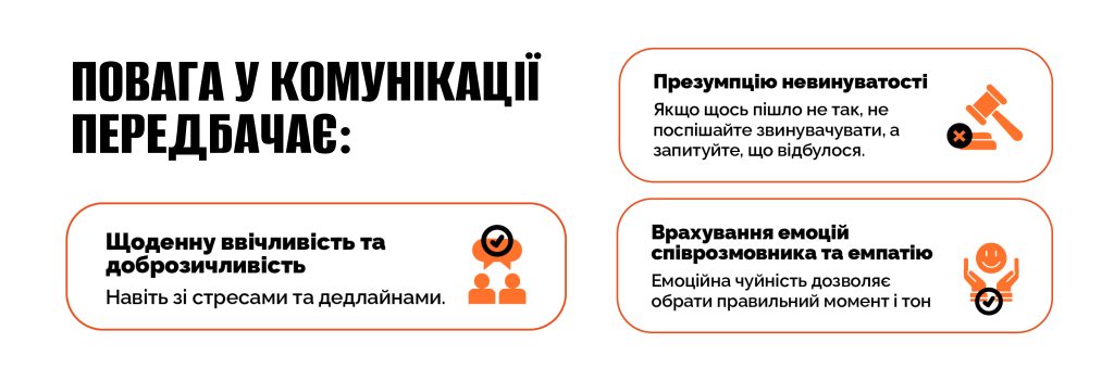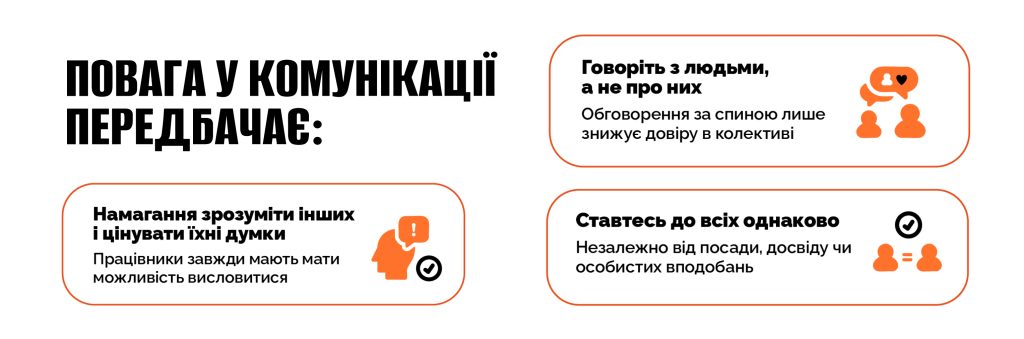 Перша наша тема стосується поваги у спілкуванні. Це не лише про «дякую» і «будь ласка». Це про те, як ми слухаємо, як реагуємо на висловлювання наших колег, як критикуємо – вживу чи в робочих чатах.