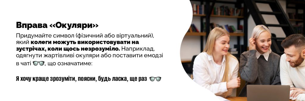 Візуальна й легка практика – «окуляри розуміння»: Використовуйте фізичний або віртуальний символ, наприклад, окуляри, який колеги можуть використовувати на зустрічах чи в переписці. Коли хтось з працівників одягає окуляри або ставить відповідне емодзі в чаті, це означатиме: «Поясни, будь ласка, ще раз. Я хочу краще зрозуміти».